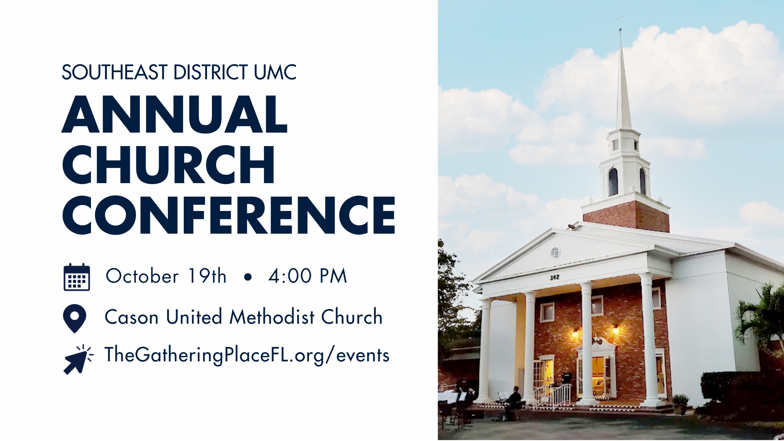 All church members are invited to attend our Annual Church Conference on Sunday, October 19th at 4:00 PM at: Cason UMC – 342 N Swinton Ave, Delray Beach, FL 33444. The Church Conference is an opportunity to worship with The Gathering Place and our greater District UMC Church family. When: October 19, 2025 Where: Cason… Read More »Southeast District UMC Annual Church Conference | October 19, 2025